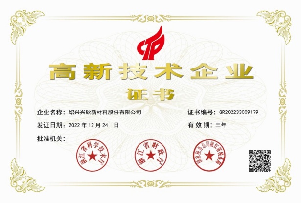 紹興興欣新材料股份有限公司成立于2002年06月27日,占地面積122畝,位于杭州灣上虞經(jīng)濟技術(shù)開發(fā)區(qū)拓展路2號,現(xiàn)有職工200余人,專業(yè)技術(shù)人員50余人;博士、碩士研究生30余人組成的一支知識型、專業(yè)化的技術(shù)科研團隊。公司面向全球市場,專業(yè)開發(fā)電子化學(xué)品、環(huán)?;瘜W(xué)品、醫(yī)藥中間體、高分子材料等先進新材料重點領(lǐng)域的省級科技型企業(yè);建有浙江上虞、安徽東至兩個生產(chǎn)基地。目前為“國家高新技術(shù)企業(yè)”、浙江省“隱形冠軍”企業(yè)、浙江省專精特新中小企業(yè);建有“省級”研究開發(fā)中心,共建天津大學(xué)浙江紹興研究院電子化學(xué)品研發(fā)中心。
